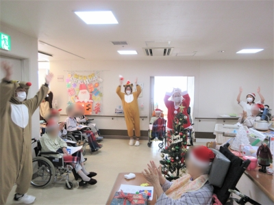 サンタクロースやトナカイの出し物や、皆様とクリスマスソングを合唱したりなど、楽しんで頂きました。来月は、お正月レクリエーションを行いますので、また様子をご報告します!!